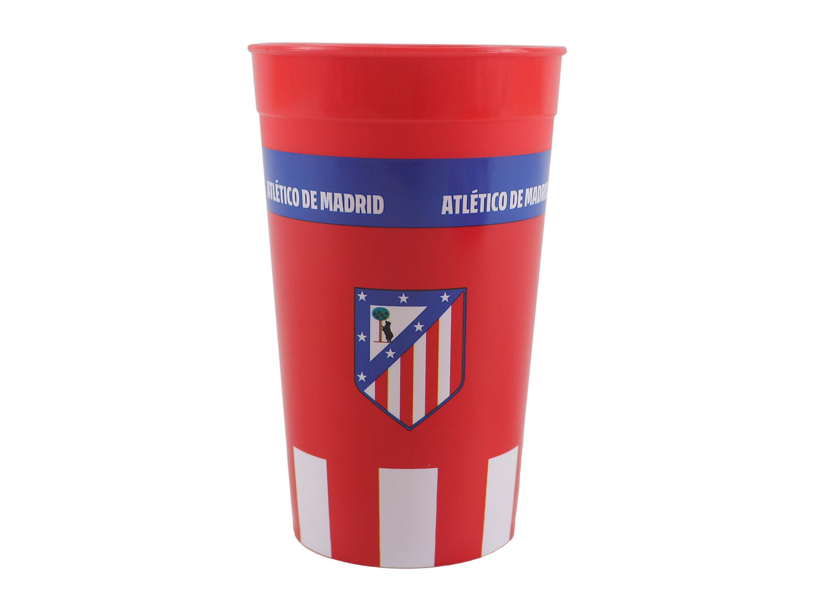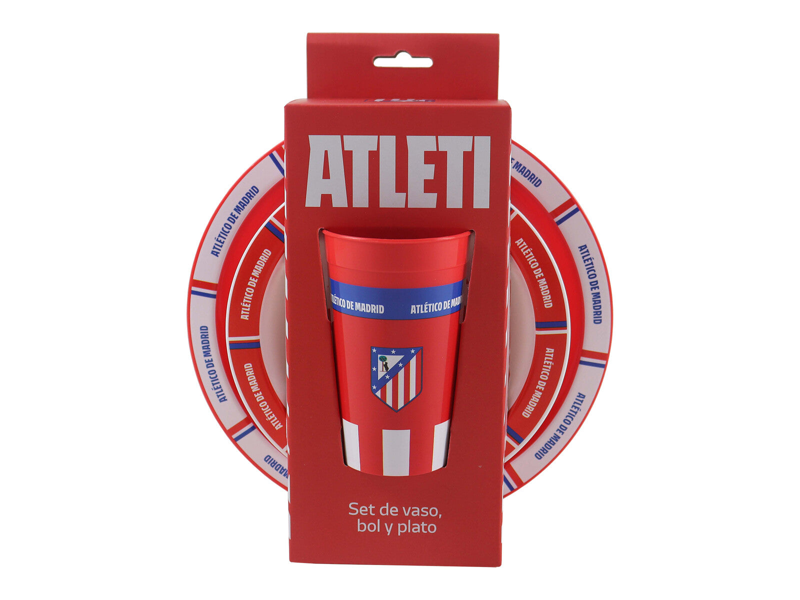 Incluye plato, vaso y bol decorados con los colores y el escudo del Atlético de Madrid.